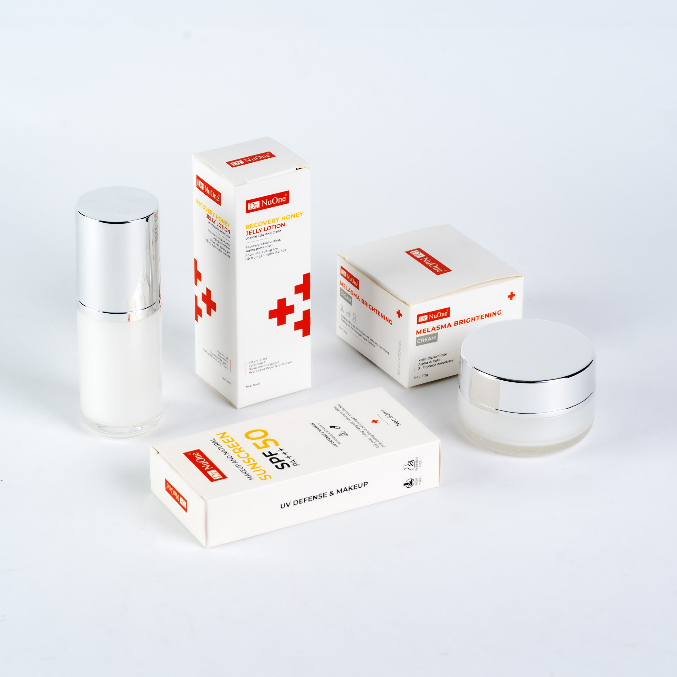 Thiết kế bộ hộp giấy đựng mỹ phẩm NuOne mang phong cách tối giản, chuẩn y khoa và tinh tế, thể hiện rõ định vị của dòng sản phẩm chăm sóc da chuyên sâu, hướng đến sự an toàn và hiệu quả.