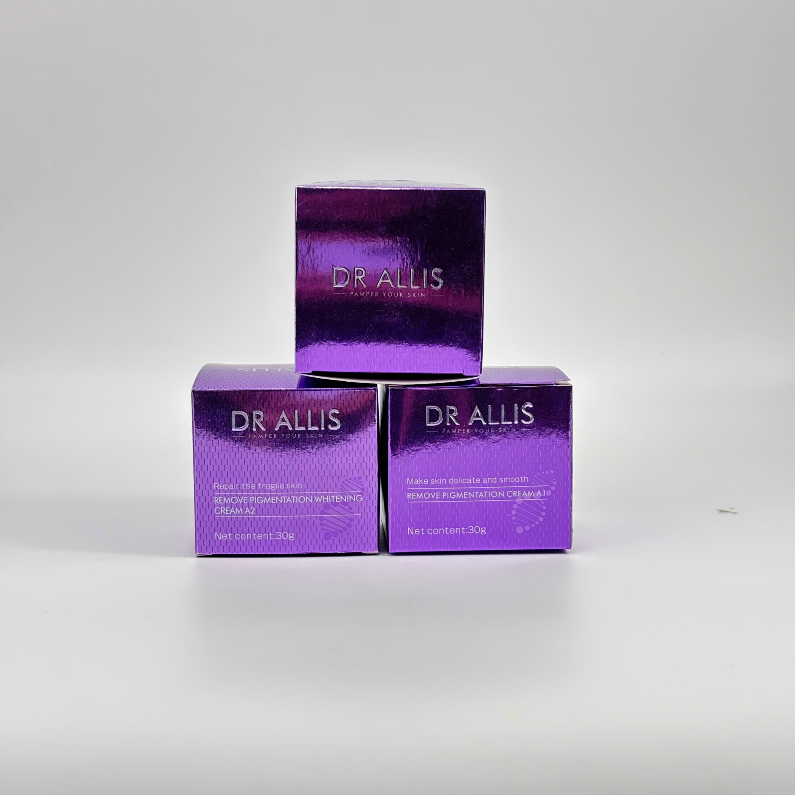 Cảm giác đầu tiên khi nhìn thấy hộp mỹ phẩm Dr. Allis chính là sự phản chiếu của ánh sáng. Lớp cán bóng trên bề mặt hộp tạo hiệu ứng gương nhẹ, giúp ánh sáng di chuyển linh hoạt theo từng góc nhìn